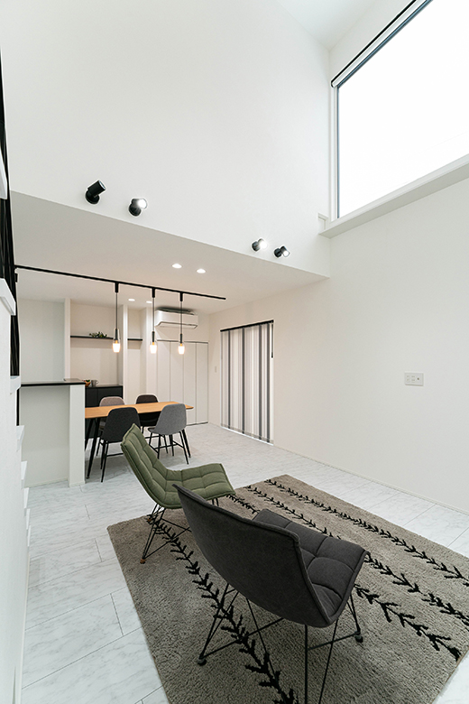 リビングには吹抜けがあり、開放感あふれる空間が広がる。