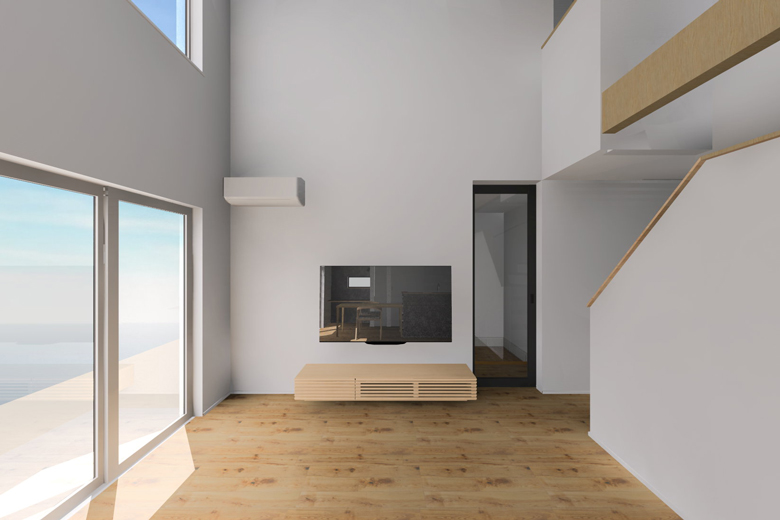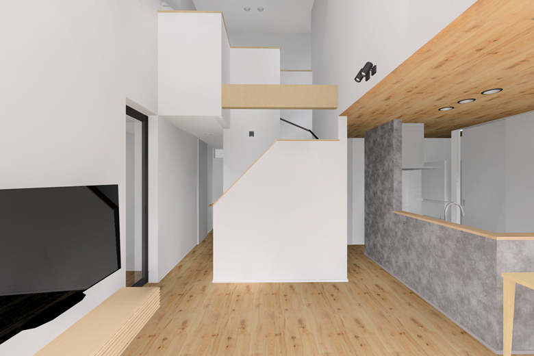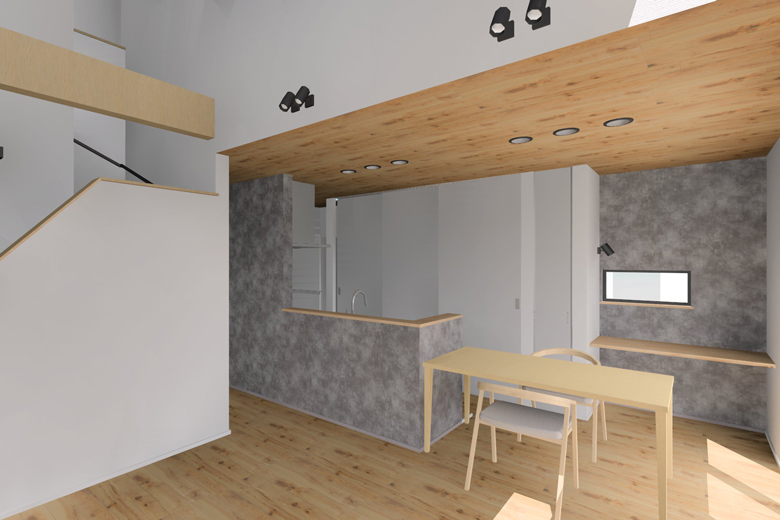 リビング上部には大きな吹き抜けと大きな窓を配し、明るさと開放感を得て、実際の帖数以上に感じる空間も実現。
