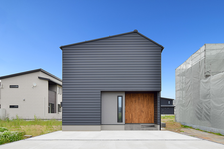 玄関ポーチに施された木と吹付のコラボレーション外壁の演出も、訪れる人を楽しませてくれる。