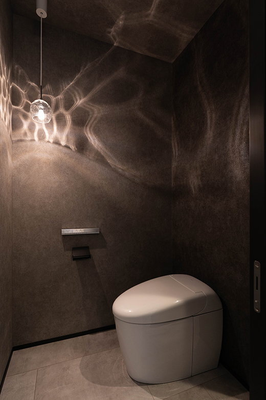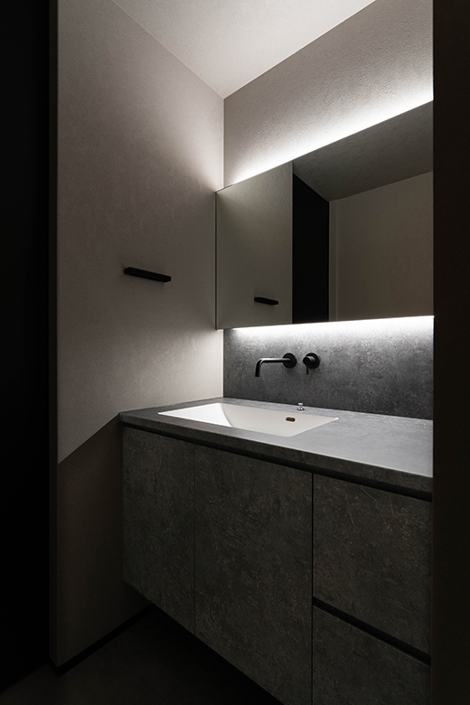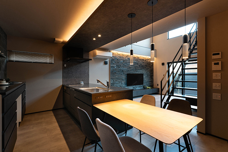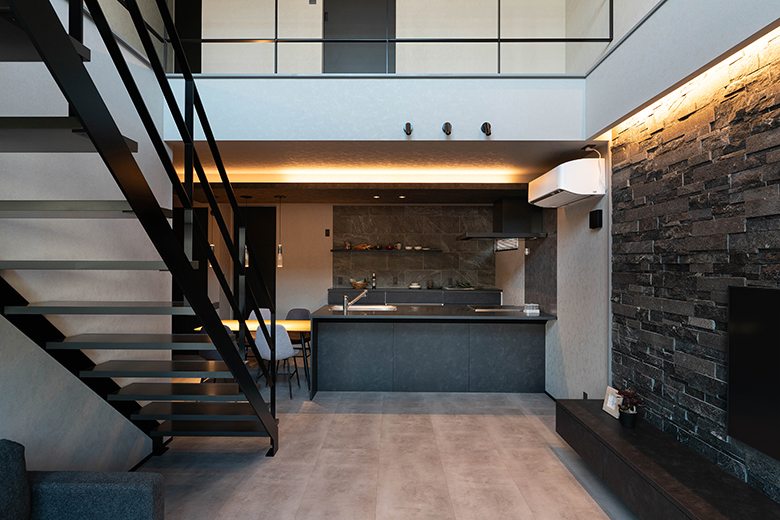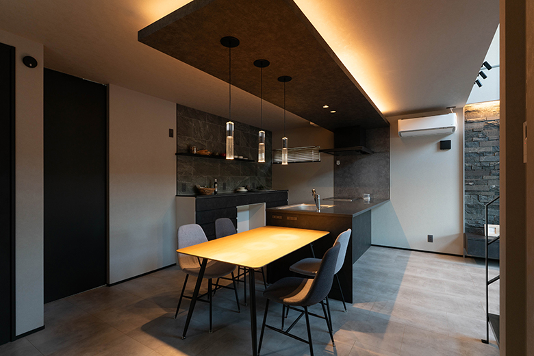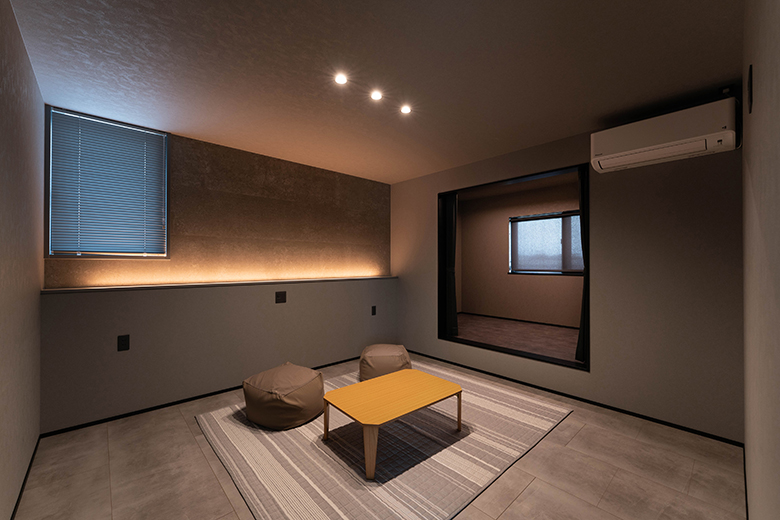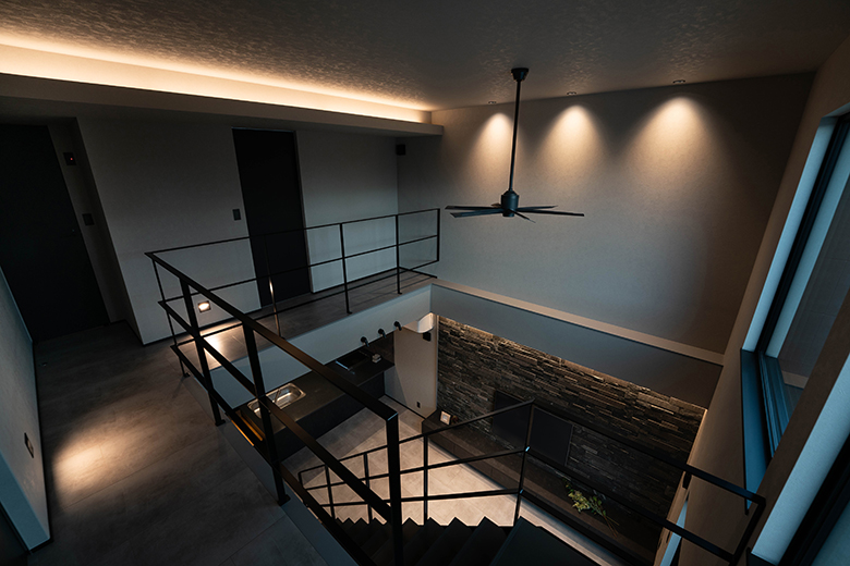 ランスペースは夜になると植栽をライトアップし、目隠し壁によってプライベートなテラス空間へと変化。