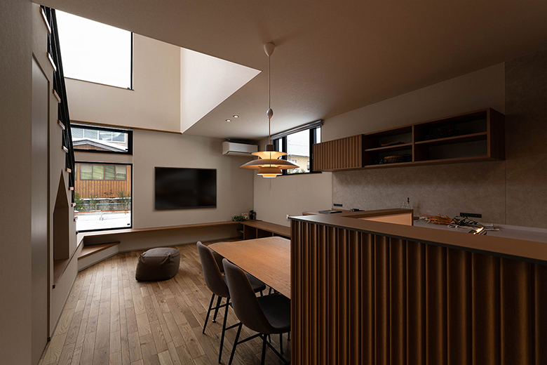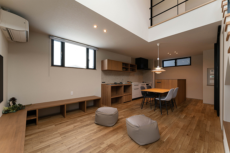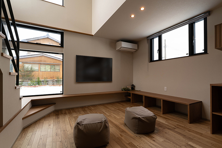 造作ベンチのある吹き抜けリビングは、心地よいくつろぎを生み出す。