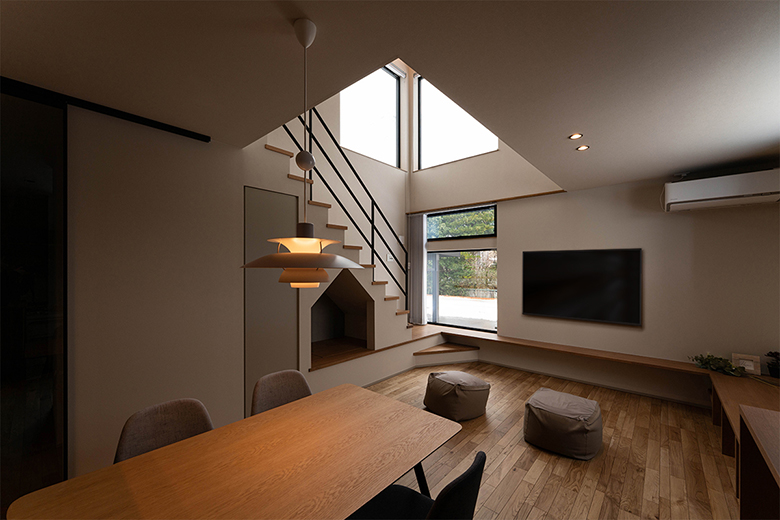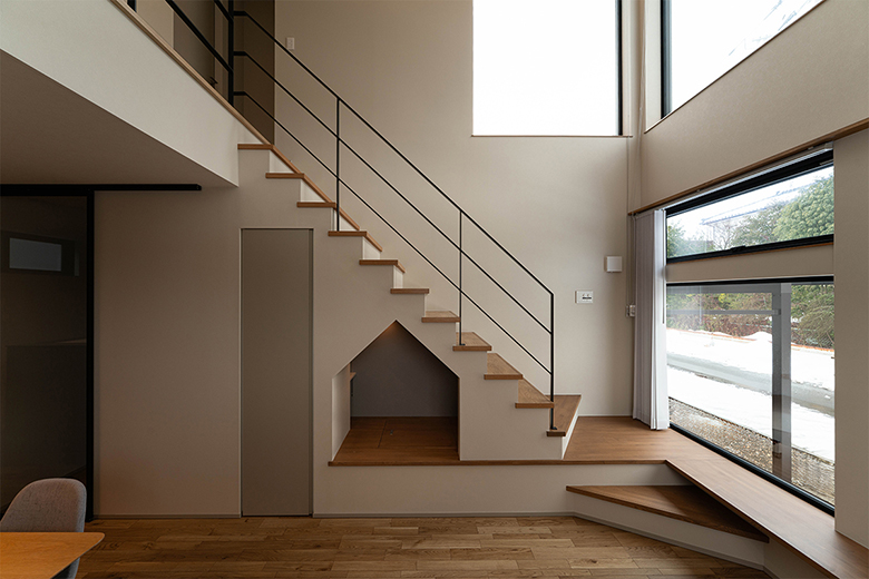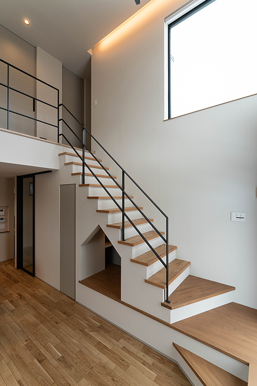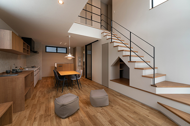 階段下にはお子様が安心して遊べるヌックスペースを設置し、家族の時間が自然と育まれる工夫も。