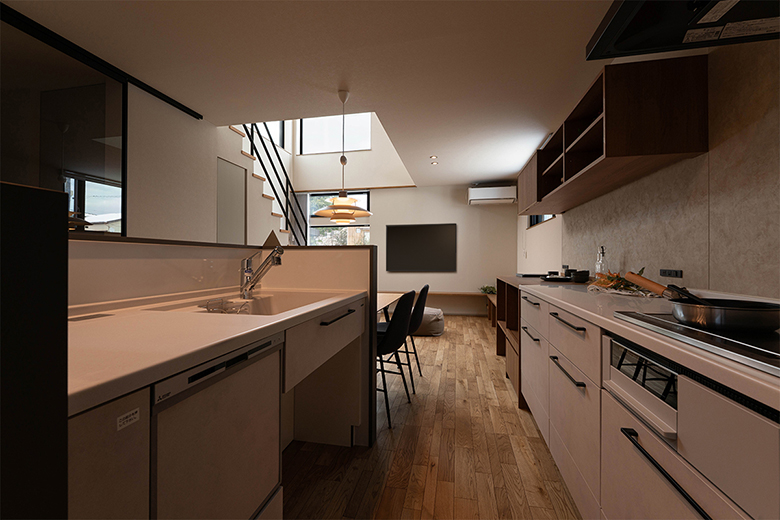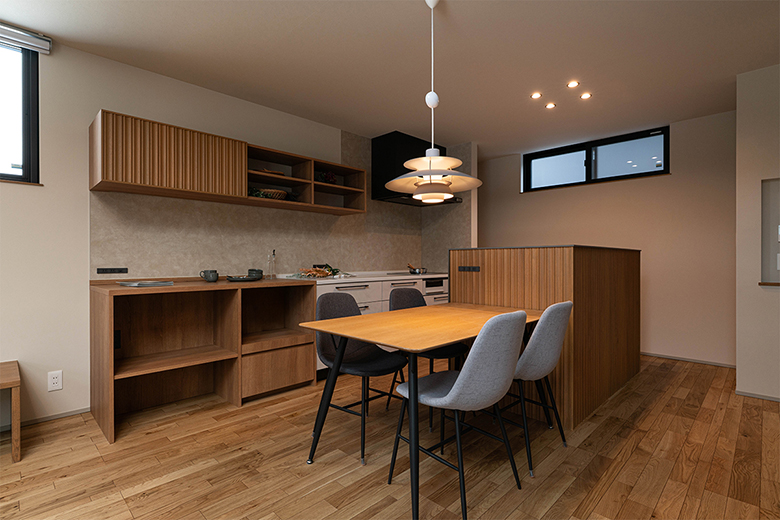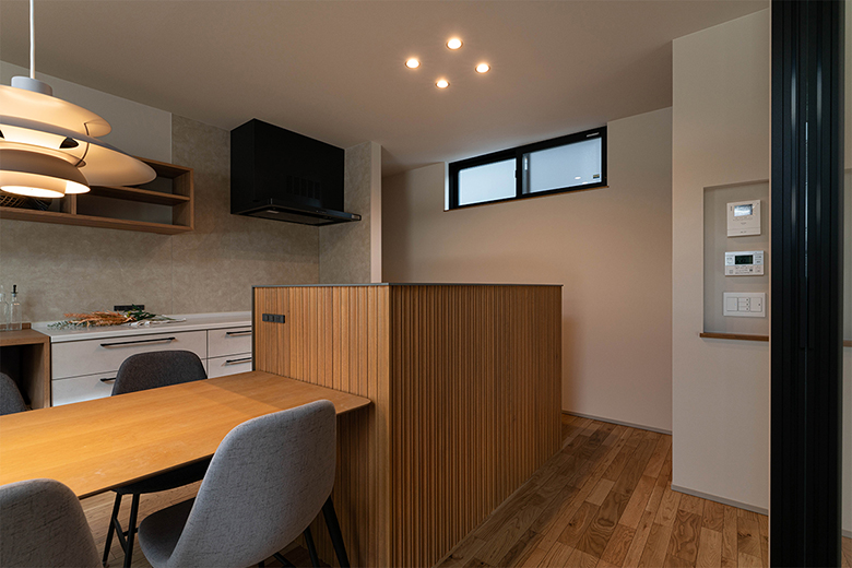 リブパネルをあしらった二の字型キッチンは、料理スペースを広く確保し、ご家族での調理も楽しめるこだわりの空間。