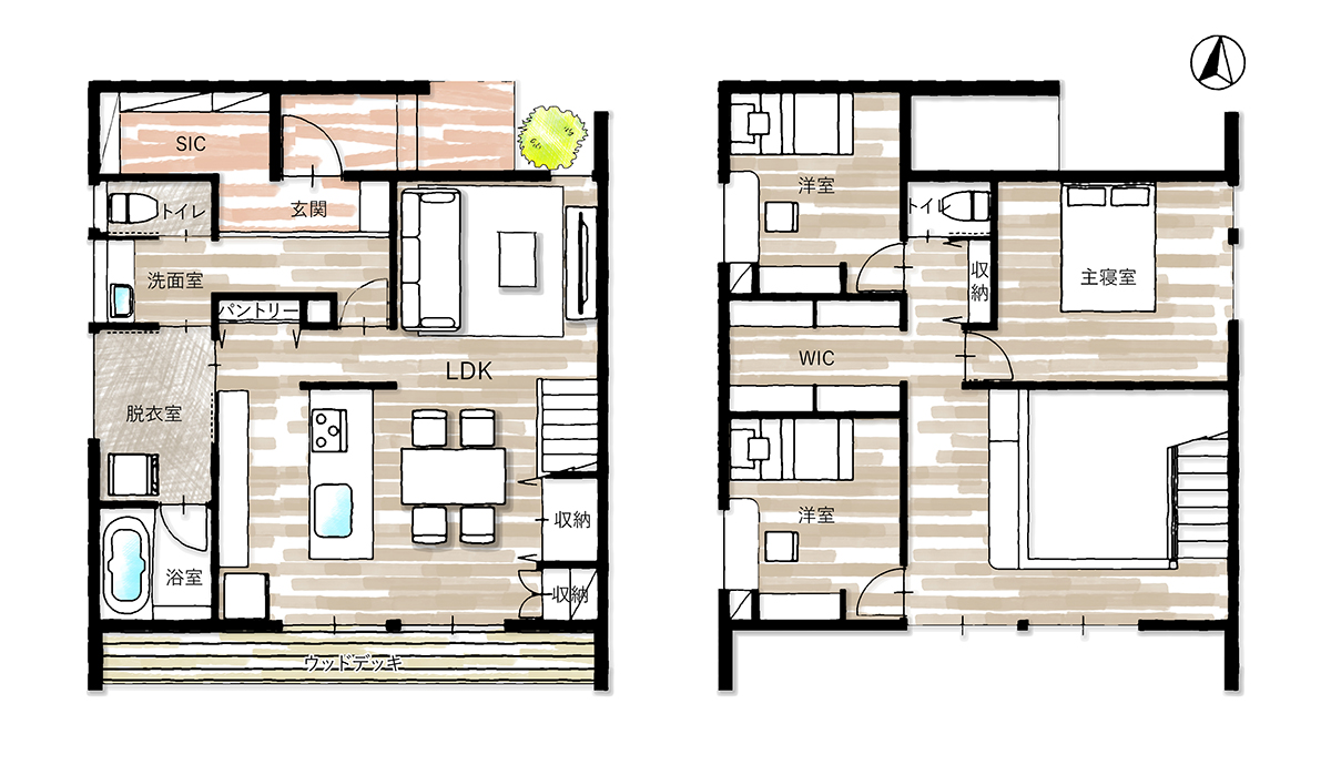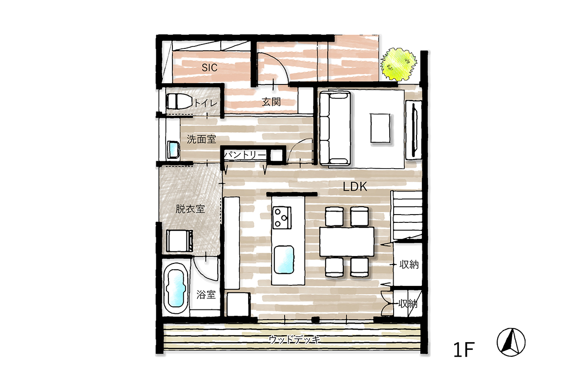 時には開放感あふれるダイニングキッチンで団らんを楽しみ、時には落ち着いた雰囲気のリビングでくつろぐことができる住まい。