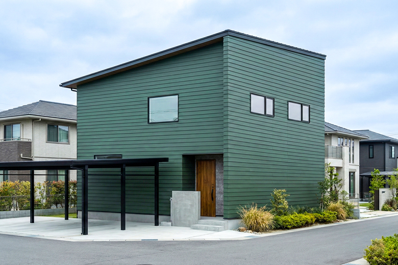 外観は南と東に袖壁を配置し、深い軒を大きく出すことで立体感と落ち着いた存在感を演出。