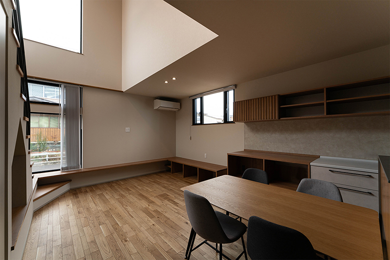 造作ベンチのある吹き抜けリビングは、心地よいくつろぎを生み出す。