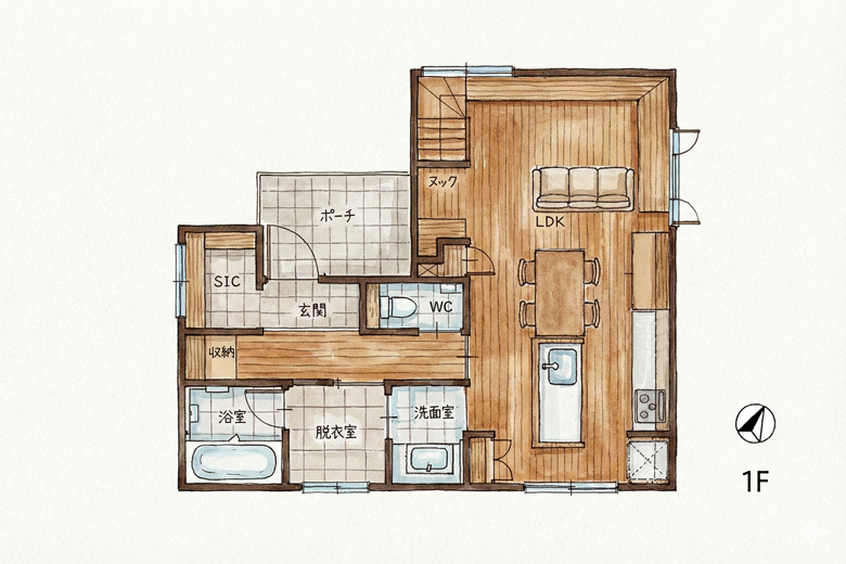 リビングと洗面台をつなげた動線設計により、冬でも住まい全体に暖かい空気が行き届く。