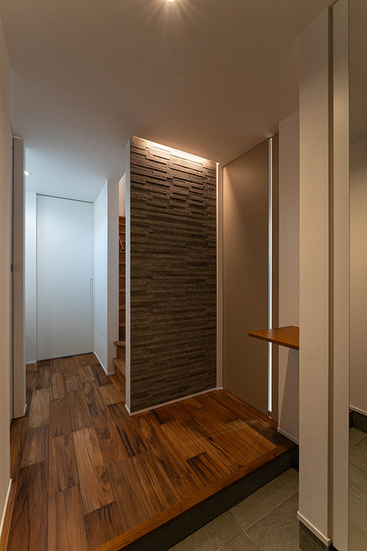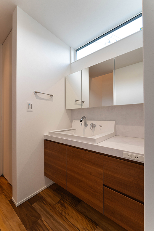 帰宅後すぐに手洗いができるよう、造作洗面を玄関付近に配置。