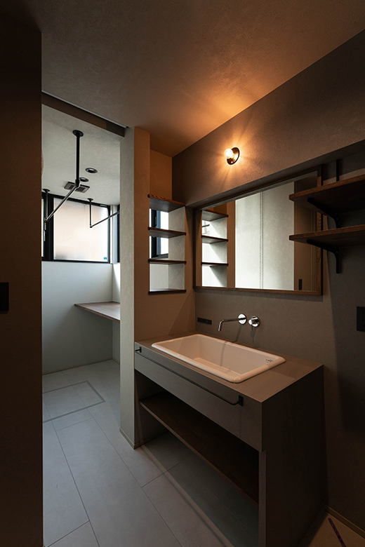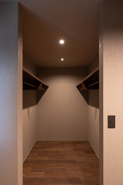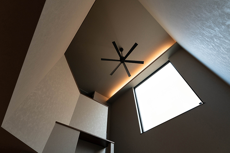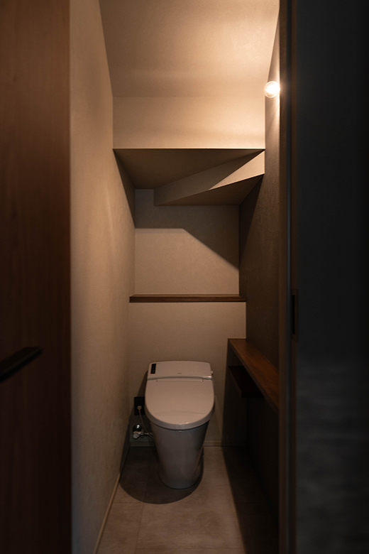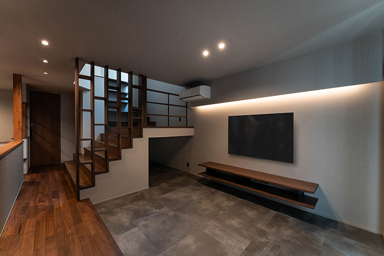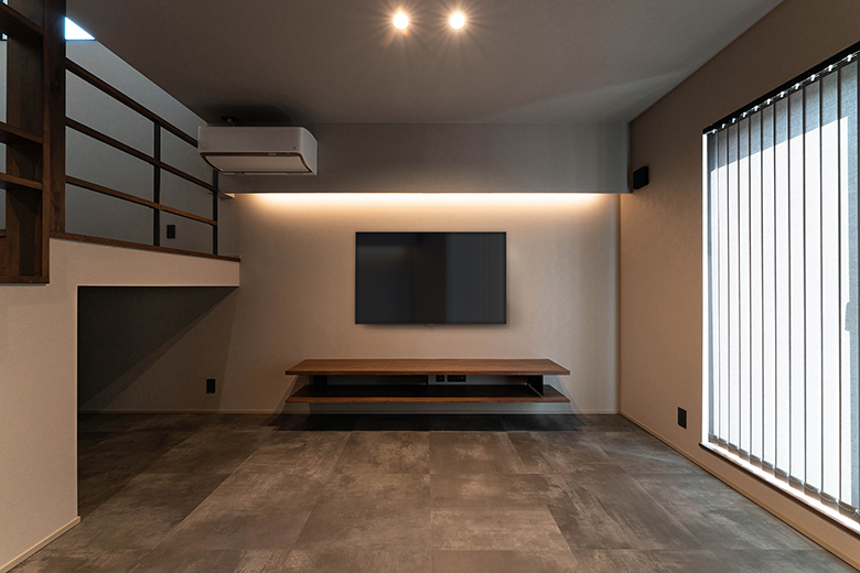 さらに、視線を惹きつける階段のデザインや、壁一面を包み込む統一感のあるグレーのトーンが、シンプルながらも上質なホテルライクな雰囲気を演出。