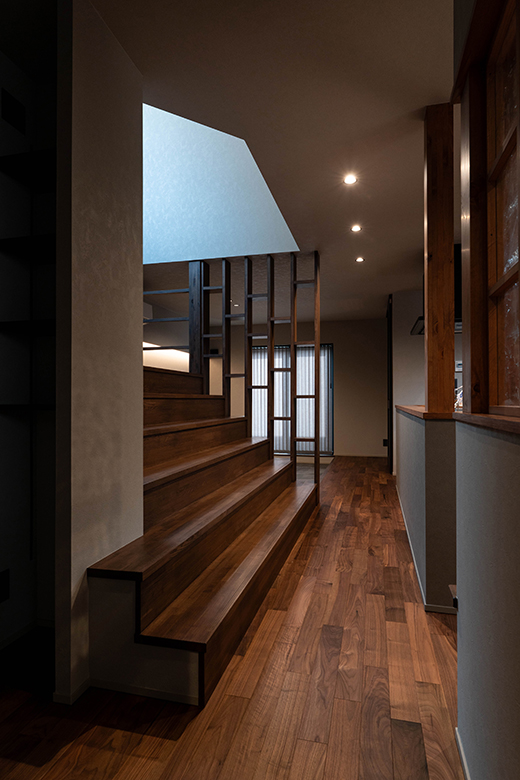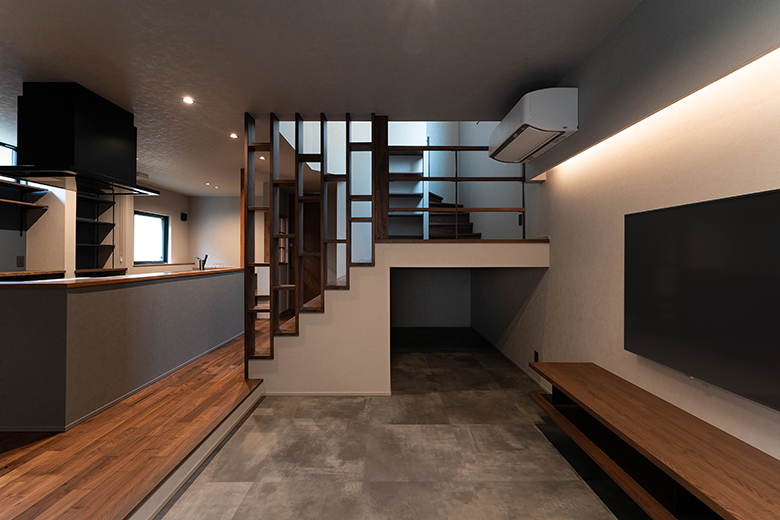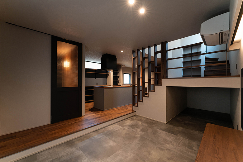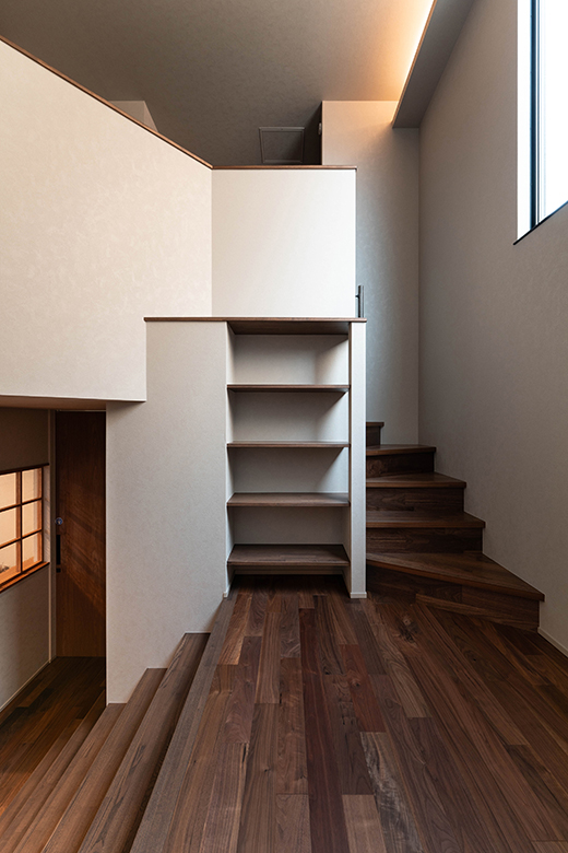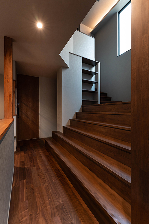 キッチンからは、開放的なリビング・ダイニング、そしてダイナミックな踊り場のある階段スペースまで、家族が集うエリア全体を見渡すことができ、