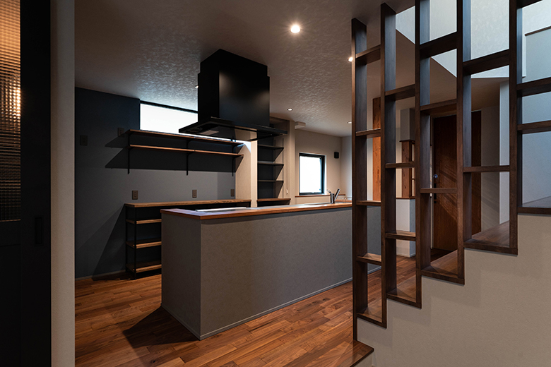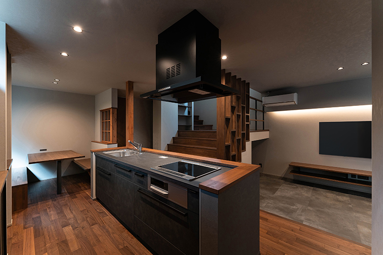 存在感のあるアイランドキッチンは、深みのある木目の床と落ち着いたグレーのコントラストの中で、空間の主役として際立つ。