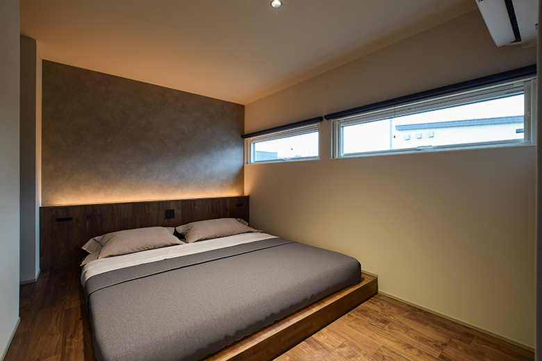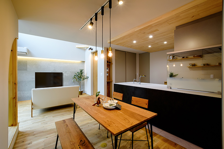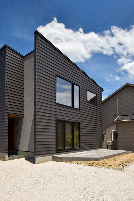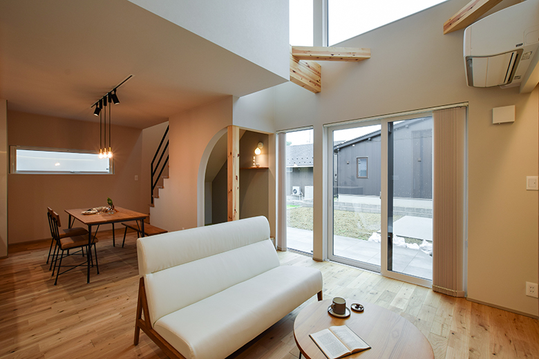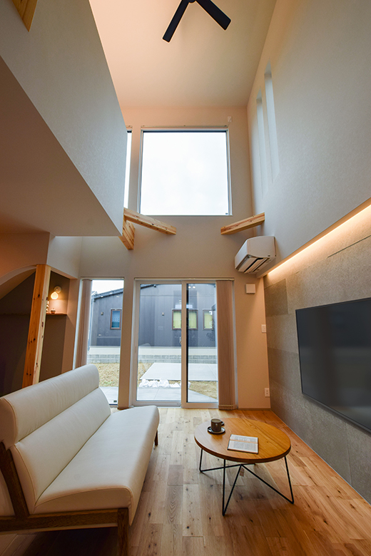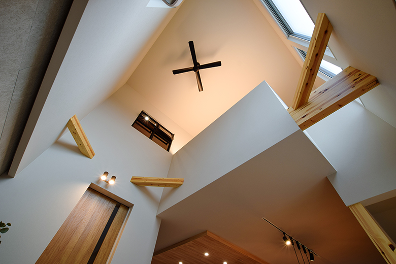 外観正面は窓を最小限に抑えたクローズドデザインでありながら、室内には大きな吹き抜けを採用し、オープンで明るい空間を演出。