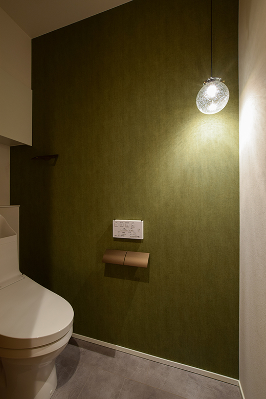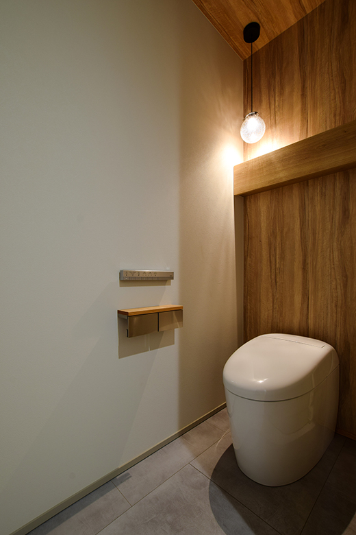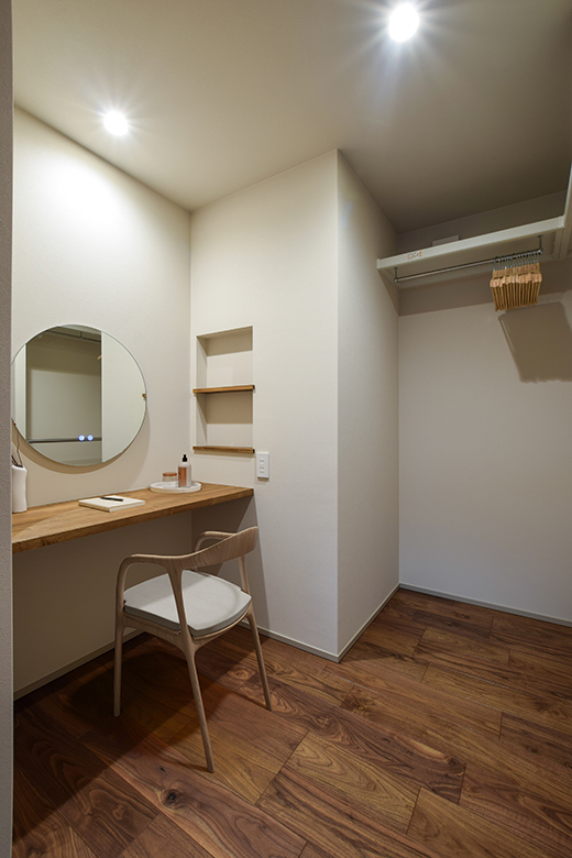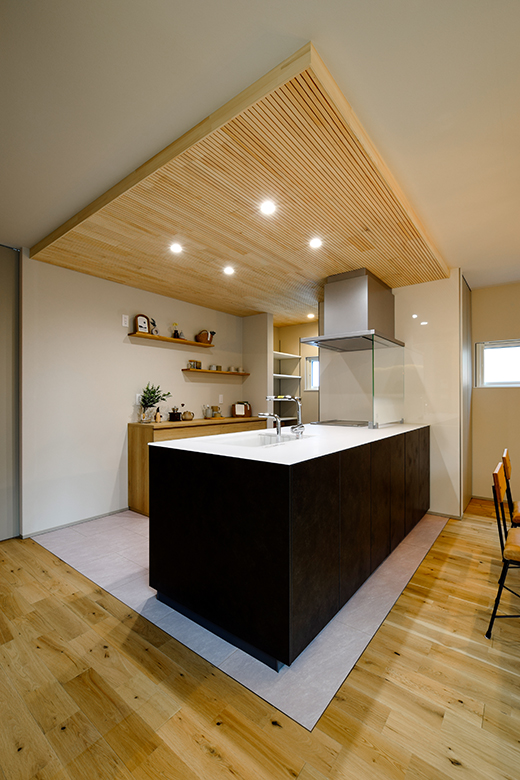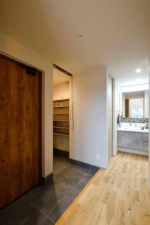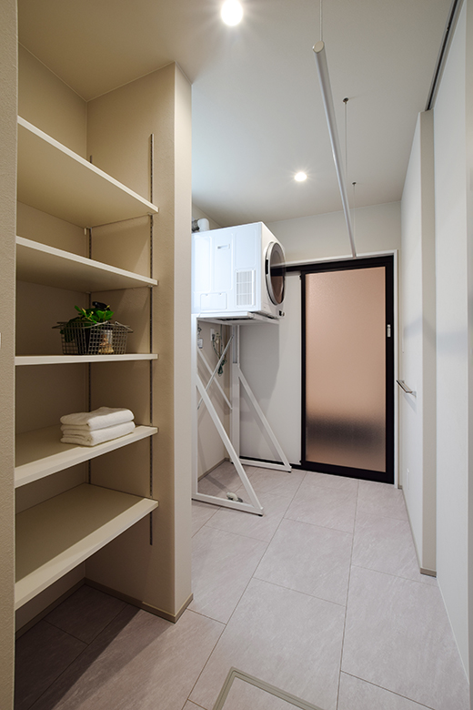 また、キッチンから直接ランドリールームへつながる動線を確保し、家事の効率化を図った。