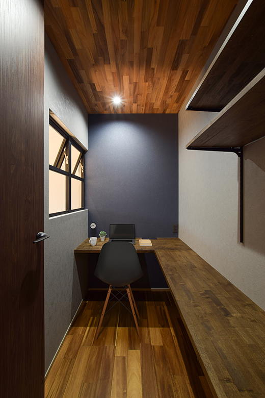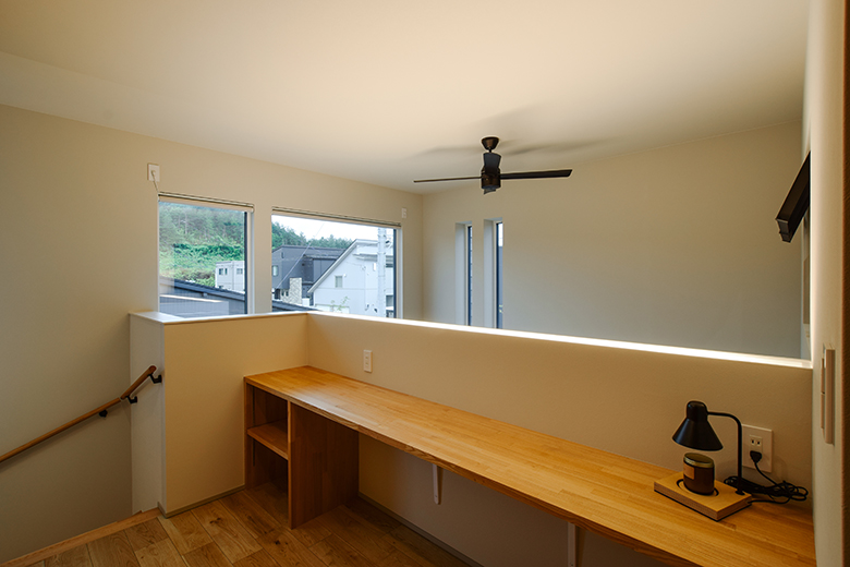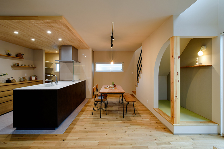 リビング階段の下には小上がり畳のヌック、2階へ上がると吹き抜けを眺められる幅広のオープンカウンター、さらには個室書斎など、コンパクトな建物でありながら、こだわりが詰まったプランを実現。