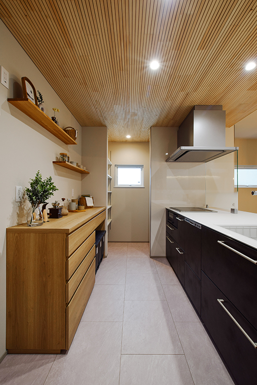 キッチンは大型のフラットキッチンを採用し、ウォークインパントリーを併設。