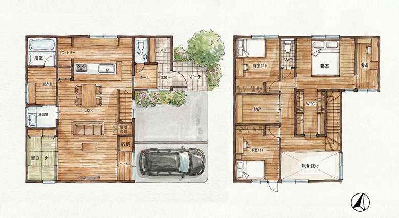 2階にはウォークスルーのWICと3帖の納戸を配置し、収納力も抜群。