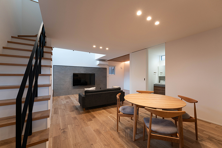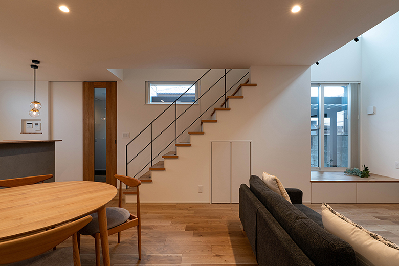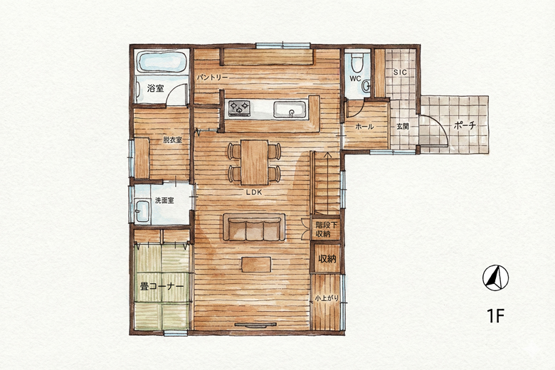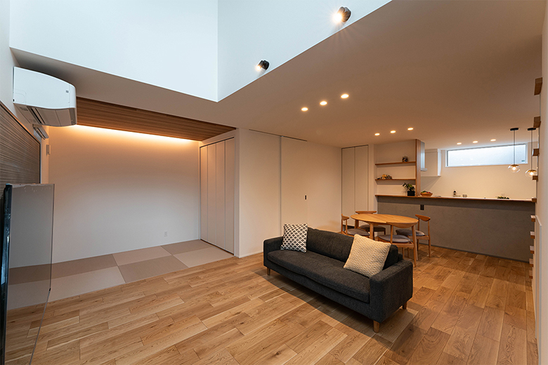 吹き抜けの開放感と、リビングに併設した畳コーナーがつながる広々としたLDKで、遊び盛りのお子さまものびのびと過ごせる住まい。