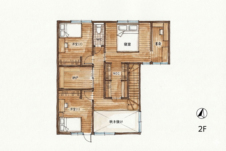 2階にはウォークスルーのWICと3帖の納戸を配置し、収納力も抜群。
